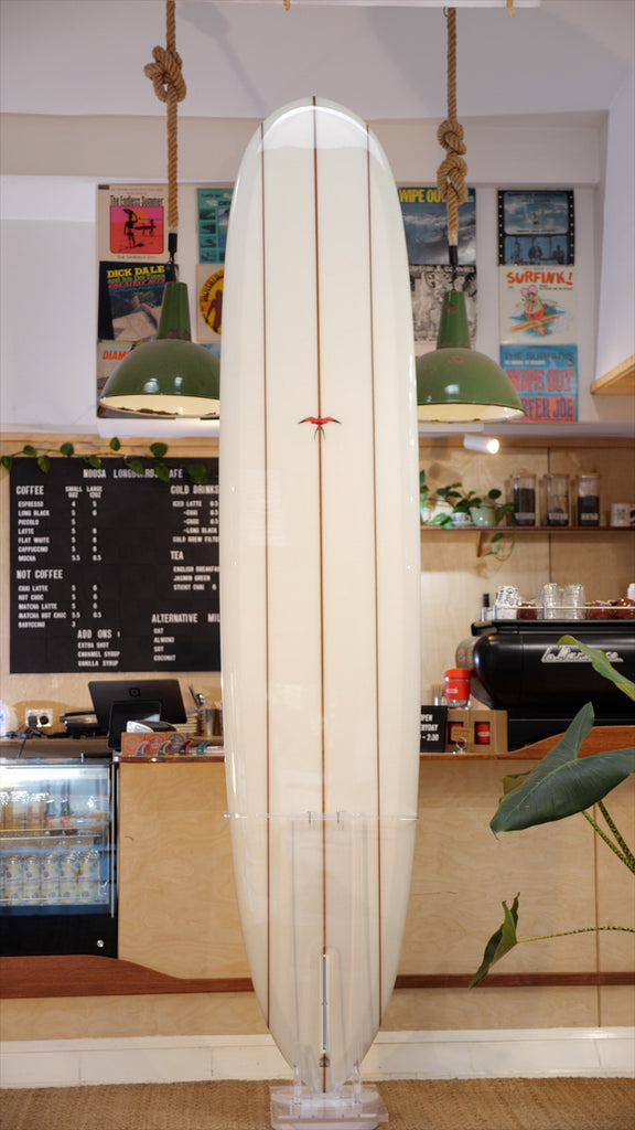 Donald pulled this design from his repetoire in the early 50's and 60's. It is a classic retro design, glassed w/ volan cloth so weight stays true to the era from which it originated. So called the "Double Ender" because both the nose and tail are pulled in for speedy, overhead sections. Although this board can be ridden in any size waves, its full potential shines in waves that are bigger than waist high.
